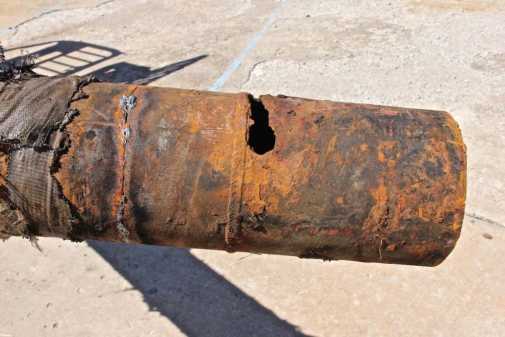 The gaping hole adjacent to the girth weld in this line pipe segment resulted from corrosion, but the underlying mechanism(s) were not so obvious.