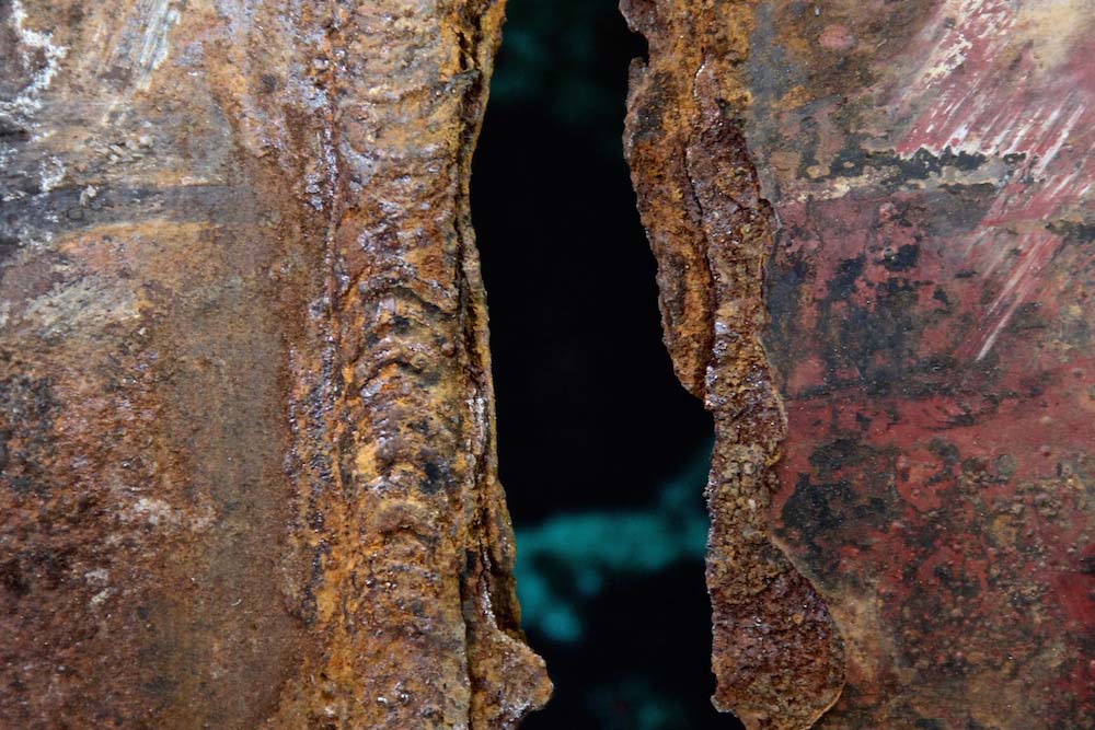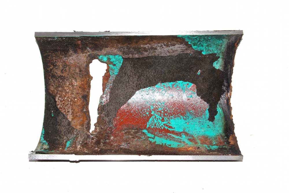 Longitudinals sections of the pipe body revealed multiple coatings had been applied to the interior wall. Patches of the protective layers had detached from the surface, unveiling a deeply pitted and generally corroded pipe surface.